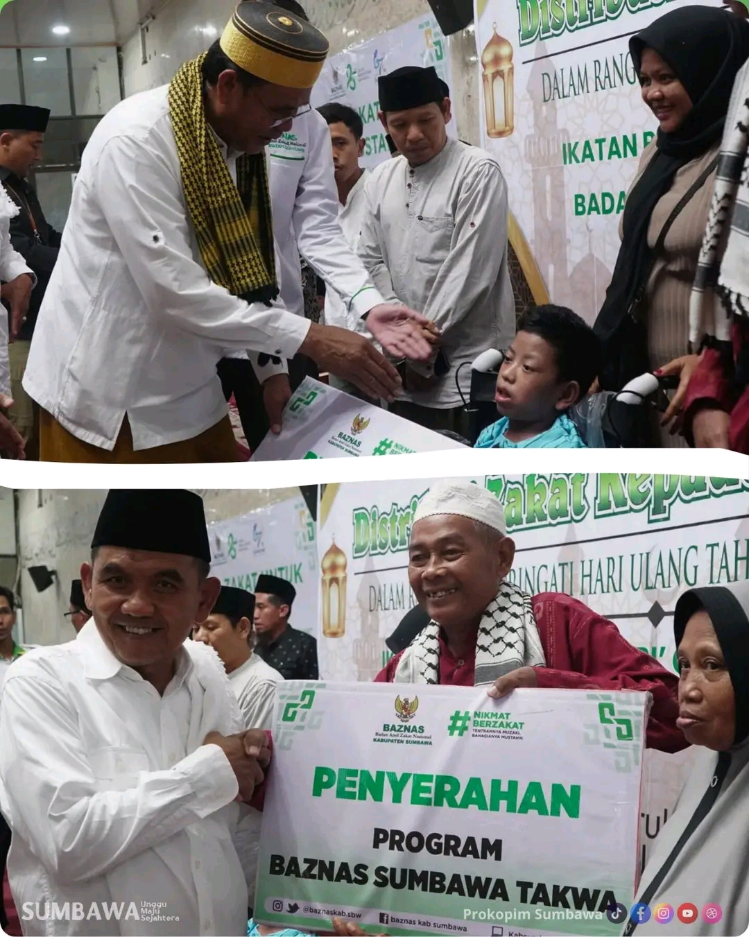 Pada kesempatan yang sama, dilakukan pendistribusian zakat, infaq, dan sedekah (ZIS) kepada 1.000 mustahiq di Kabupaten Sumbawa. Bantuan tersebut mencakup bidang pendidikan, guru ngaji, TPQ, alat kesehatan, UMKM, serta santri, dengan total nilai lebih dari Rp300 juta. Dana tersebut berasal dari zakat para ASN serta masyarakat Kabupaten Sumbawa yang disalurkan melalui Baznas.