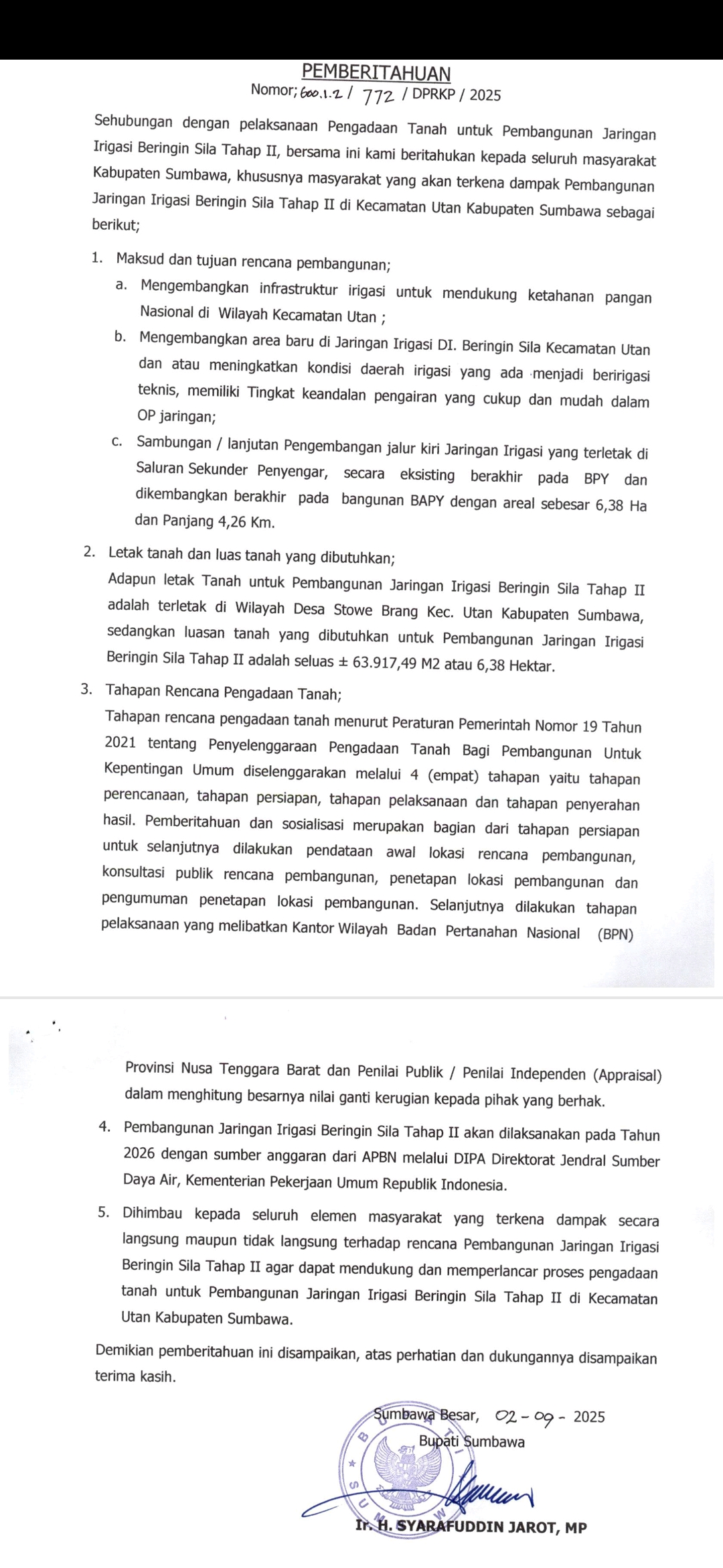 Surat Pemberitahuan Bupati Sumbawa Tentang Pengadaan Tanah Jaringan Irigasi Beringin Sila Tahap II September 26, 2025
